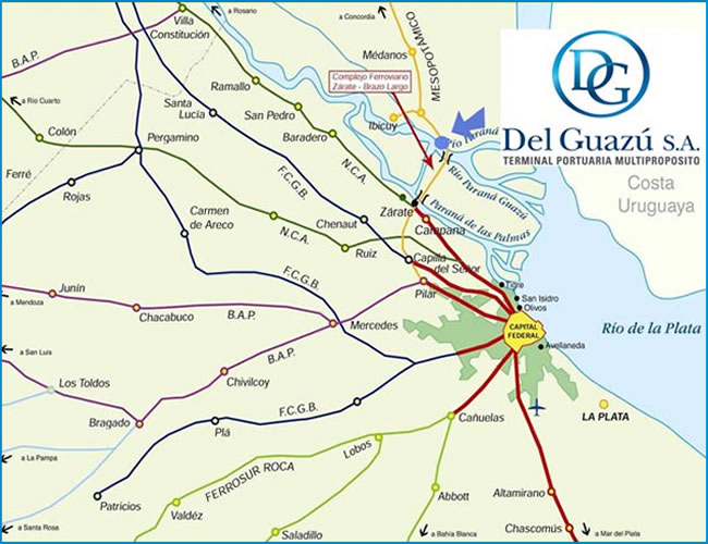 Terminal de Guazú S.A., contará con una buena oferta de servicios de transferencias de cargas. Una conexión de la trocha media del Ferrocarril Mesopotámico que va a Paraguay, Brasil y Uruguay, con la trocha ancha del Nuevo Central Argentino que une el centro y norte del País a 30km de la Terminal, y a no mas de 42km del General Belgrano Cargas llegando hasta Bolivia.